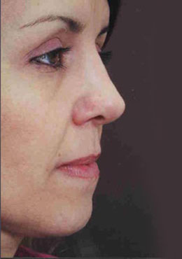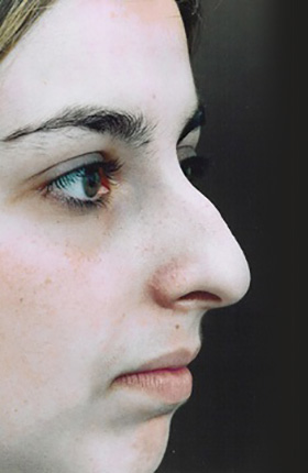This patient’s high bridge and asymmetrical nose were corrected by a combination of reduction and augmentation. Even though the upper nose and the tip were grafted to improve shape, her whole nose seems much smaller. Normal surface landmarks remain, so that the result looks unoperated.